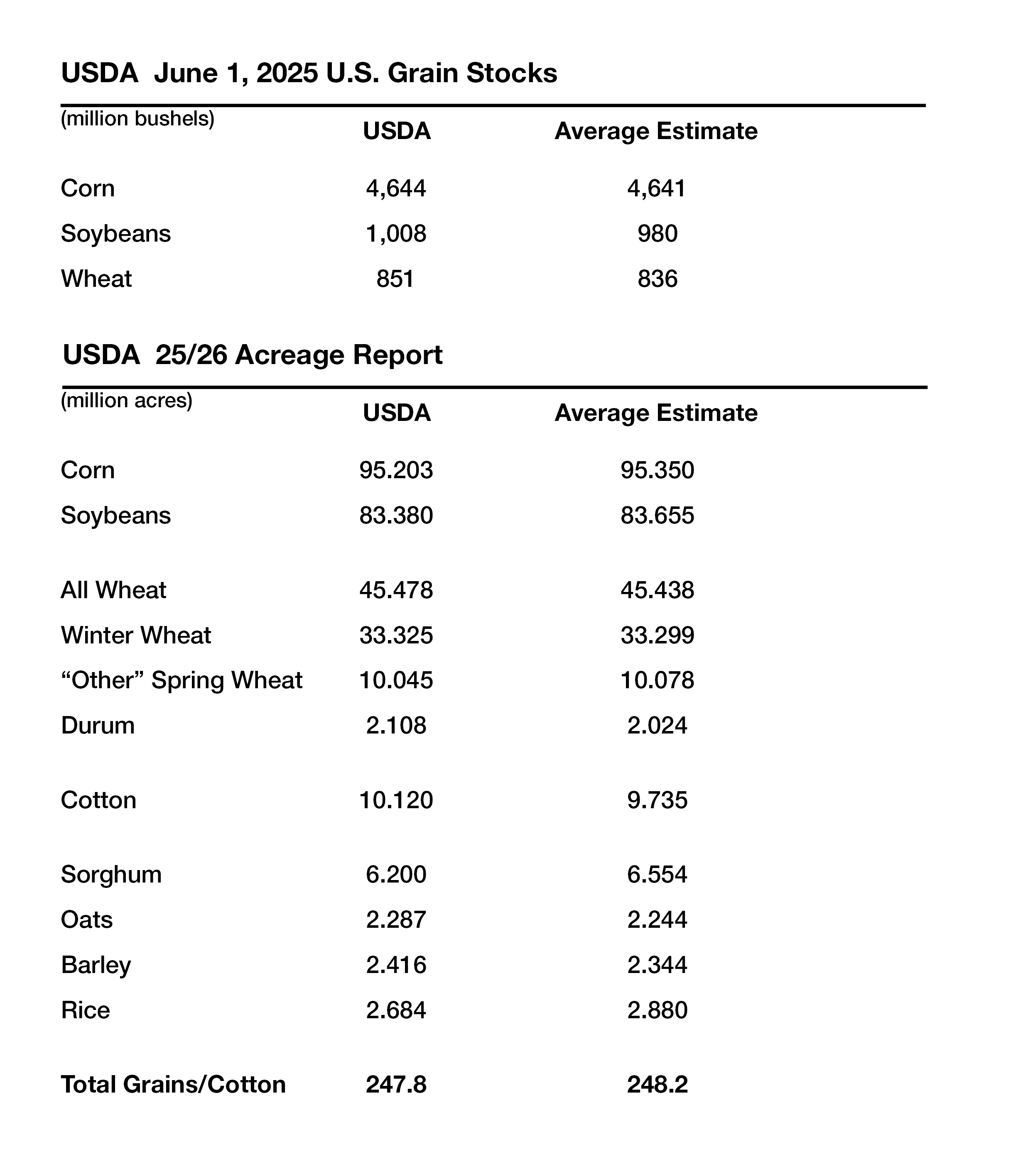 Acreage data mostly neutral to pre-report estimates while soybeans and wheat stocks are a bit higher than the average guess.