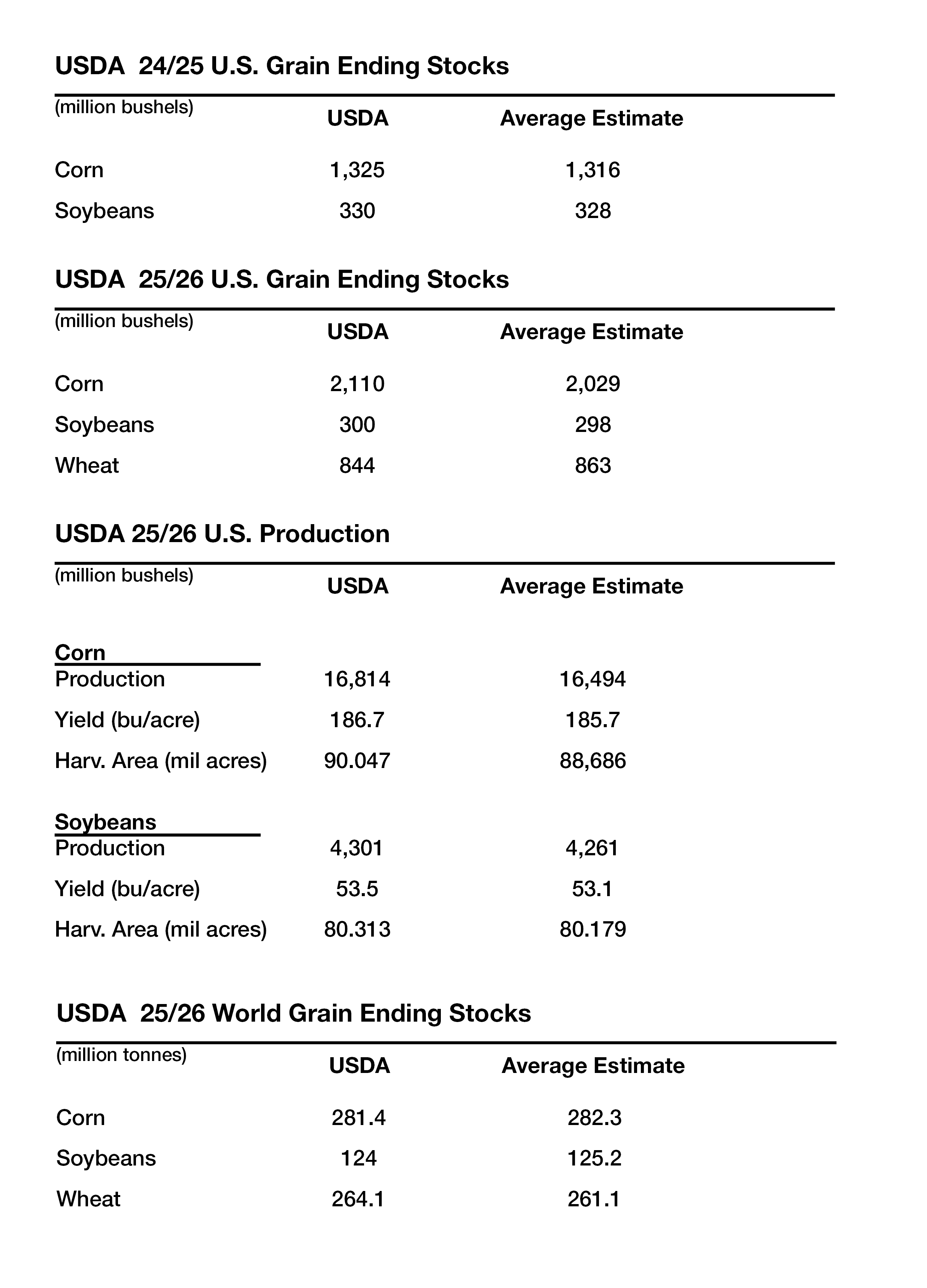 Corn acreage was increased by 1.4 million acres, while soybeans were increased by 200,000. With a modest reduction in yield, the USDA kept carryout on new crop beans at 300 million while maintaining corn carryout at last month’s 2.110 billion. Market reaction is friendly to the negative numbers, as it is doubting the accuracy of the yield.
